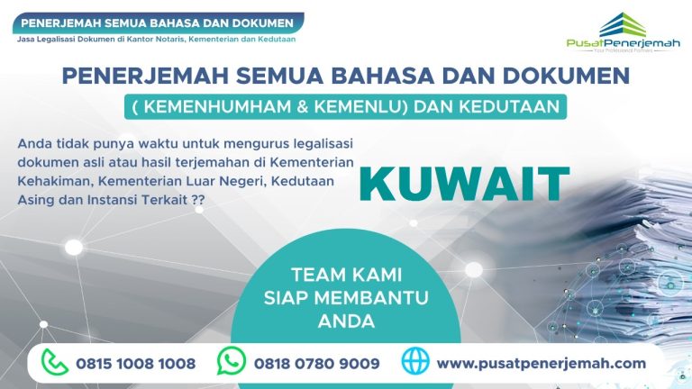 Dengan layanan online, masyarakat dari kota mana pun di Indonesia dapat mengurus terjemahan dan legalisasi legalisir pengesahan atestasi stamp di Kedutaan Kuwait dengan mudah, cepat, dan terjamin. Pilih penyedia jasa terpercaya Pusat Penerjemah WA. 081807809009 HP. 081510081008 – 081319201920.