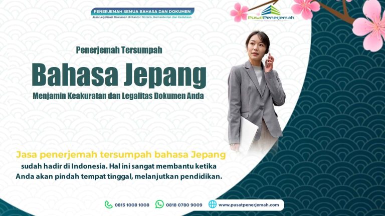 Lembaga Pusat Penerjemah, melalui website resmi kami, www.pusatpenerjemah.com, menawarkan jasa penerjemahan dari Bahasa Jepang ke Bahasa Indonesia dan sebaliknya. Kami menyediakan layanan penerjemahan untuk berbagai jenis dokumen, baik yang berkaitan dengan hukum, bisnis, akademik, maupun dokumen pribadi.