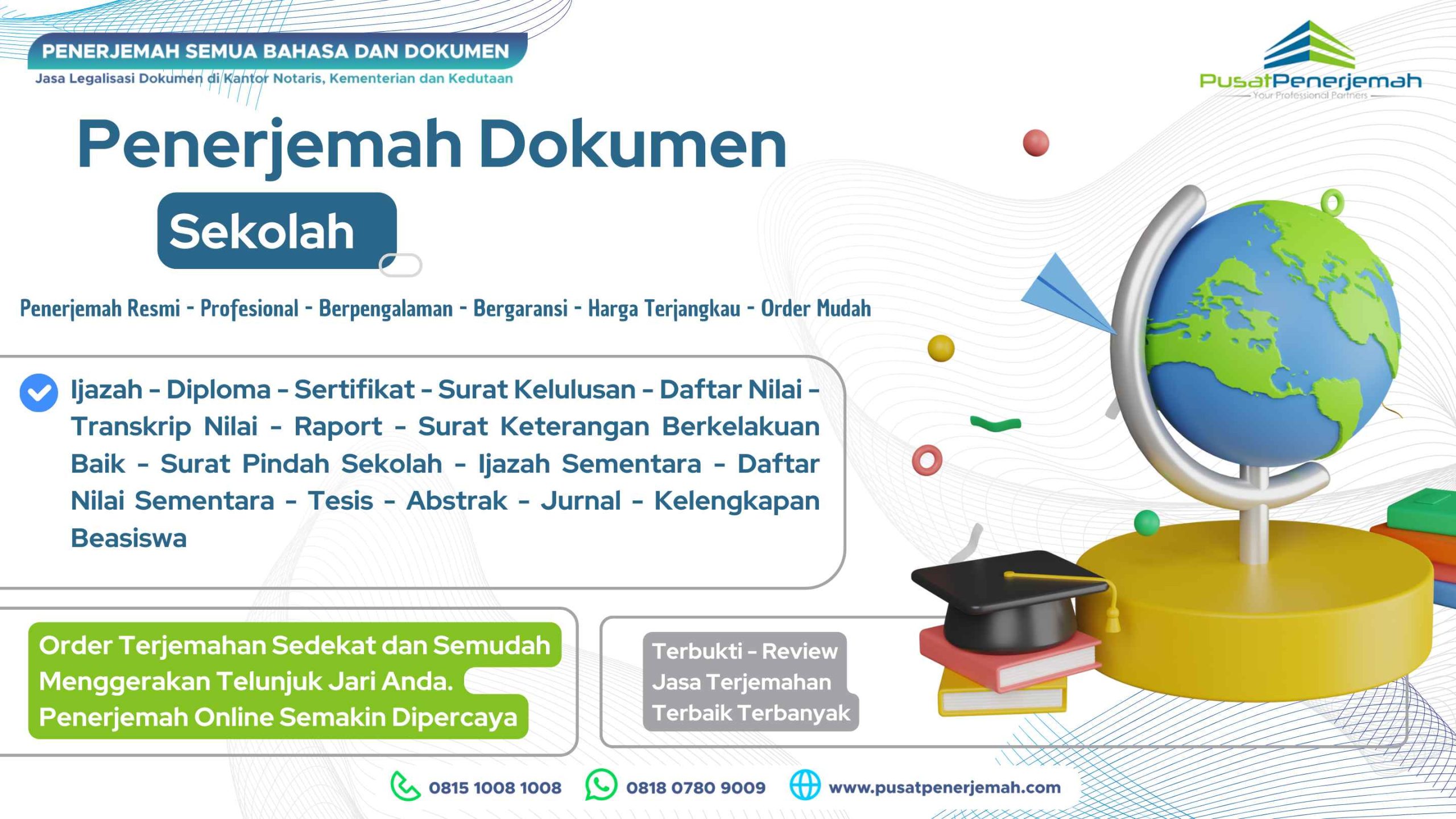 Anda dapat menikmati layanan terjemahan dan penerjemahan dokumen akademik Anda dari mana saja bahkan bila Anda di luar internasional, order tejemahan di Pusat Penerjemah cukup mudah, silahkan kirim dokumen Anda via WA atau email untuk mendapatkan estimasi biaya dan waktu pengerjaan secara cuma-cuma dan gratis (gratis estimasi), silahkan hubungi CS kami di nomor Tel. 081510081008 – 081319201920 dan WA. 081807809009.